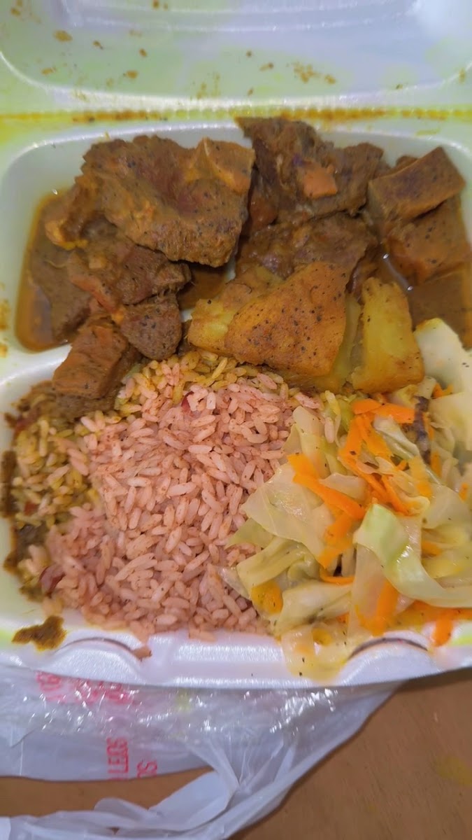 I ordered at the restaurant to go, it took maybe about 10-15 minutes for them to prepare the food. Once I got in the car I noticed that the container was leaking as you can see from the picture! But on the good side the plate was VERY FULL. I didn't want to waste all the precious gravy though. The cabbage was 10/10. There was plenty of rice, I wish the oxtail and curry were spicier but both tasted slightly above average good. My plate was supposed to come with plantain but I think they forgot it. So I give them a 3.8/5 for the leaking plate, forgetting the plantain and giving me a beef patty instead of the chicken patty I asked for.